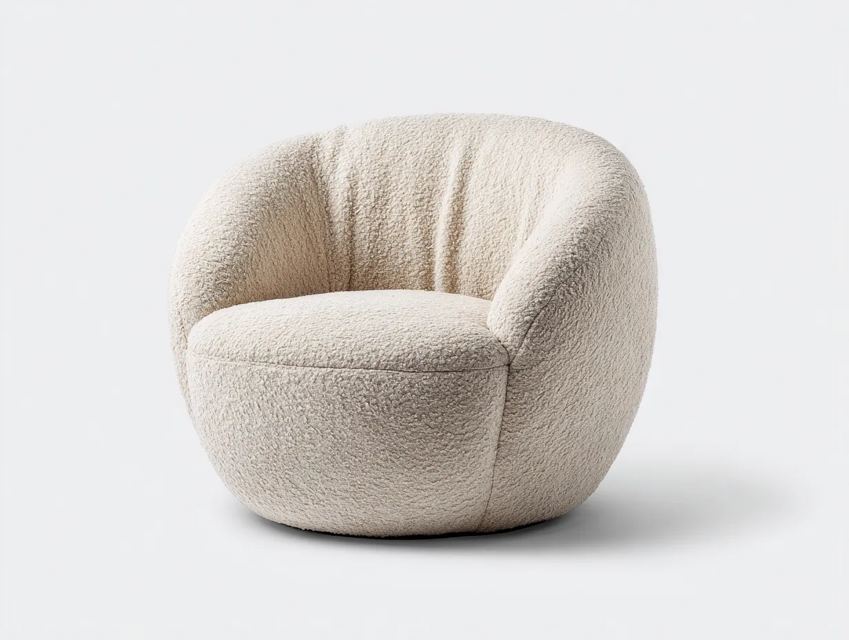 Der Bezug aus Bouclé in Cremeweiß bietet eine angenehm weiche Oberfläche mit feiner Struktur. Die sorgfältige Polsterung sorgt für stabilen Halt und komfortables Sitzen. Die solide Bauweise gewährleistet eine gleichmäßige Form und eine zuverlässige Nutzung im Alltag.