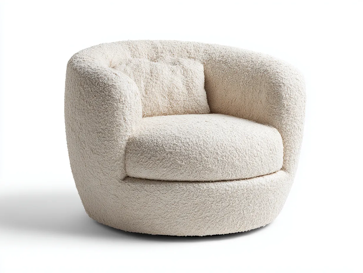 Der Bezug aus Bouclé in Cremeweiß sorgt für eine weiche, strukturierte Oberfläche. Die gepolsterte Innenkonstruktion bietet stabilen Halt und ein angenehmes Sitzgefühl im täglichen Gebrauch. Die kompakte Bauweise unterstützt eine gleichmäßige Form und eine langlebige Nutzung.